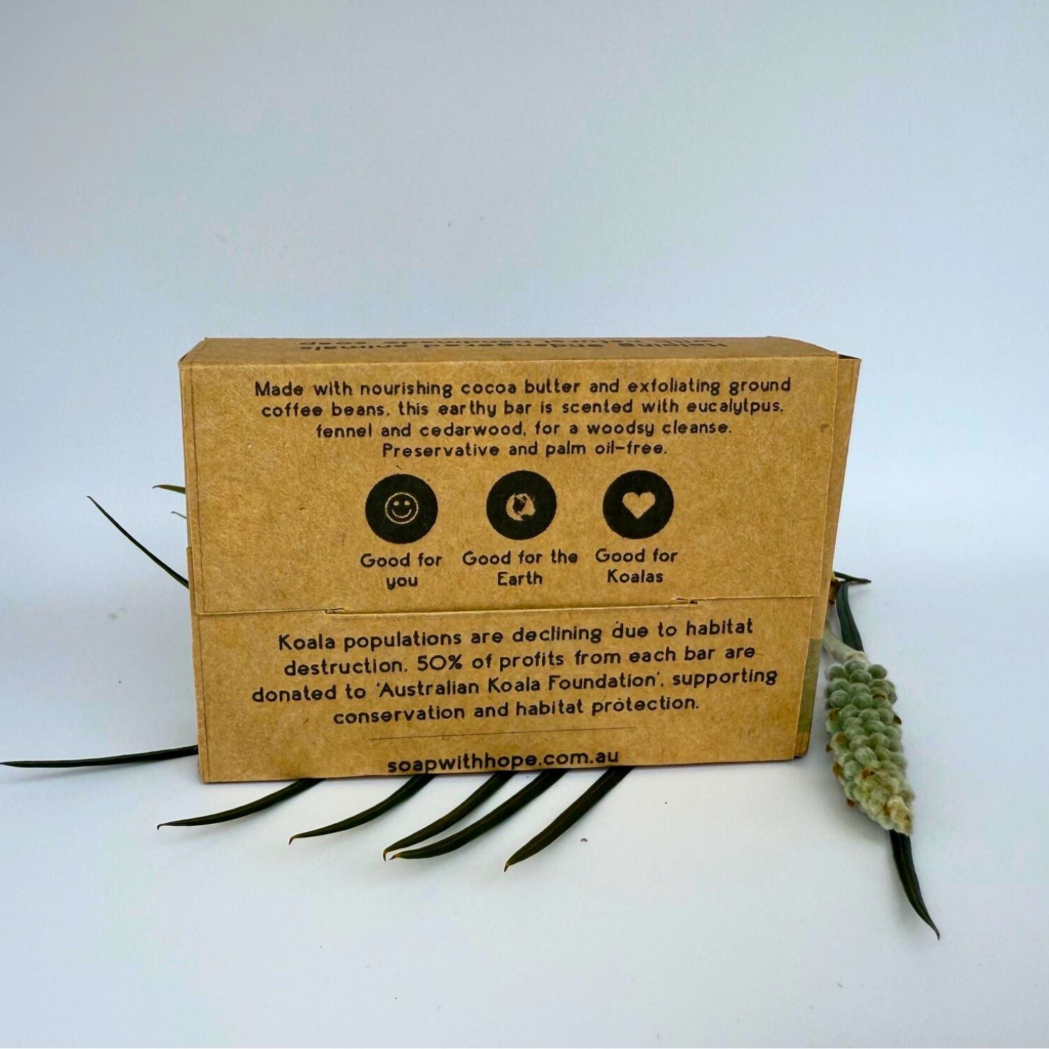 Koala: Cocoa butter soap with exfoliating coffee beans. Scented with Eucalyptus, Sweet Fennel and Cedarwood essential oils. Natural, vegan, no palm oil and cruelty-free. Handmade in Newcastle, Australia. Each bar purchased donates to saving Koalas and their habitats.