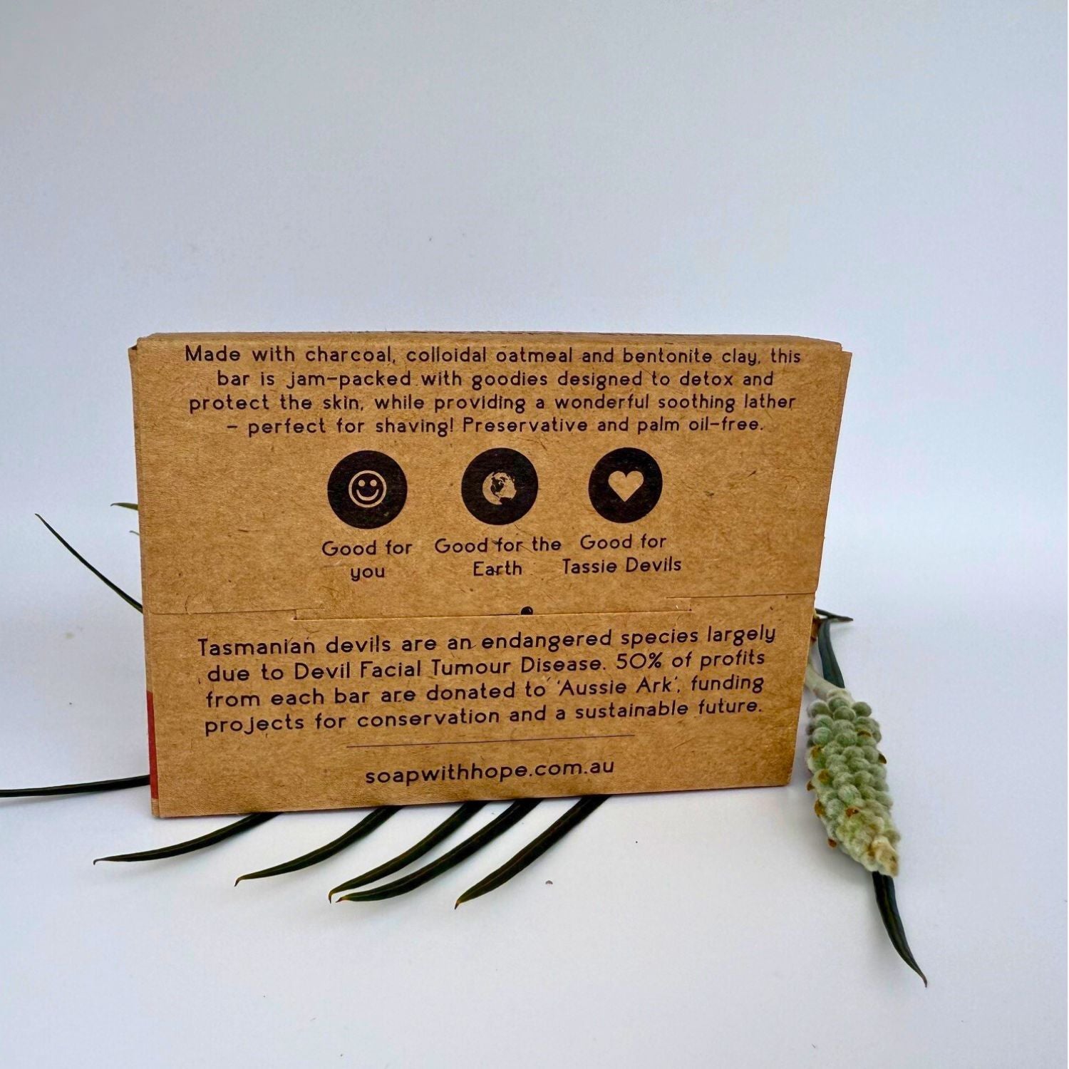 Tasmanian Devil: Soap made with charcoal, bentonite clay and colloidal oatmeal. Scented with Tea Tree and Eucalyptus essential oils. Natural, vegan, no palm oil and cruelty free. Handmade in Newcastle, Australia. Each bar purchased donates to saving Tasmanian Devils and their habitats.